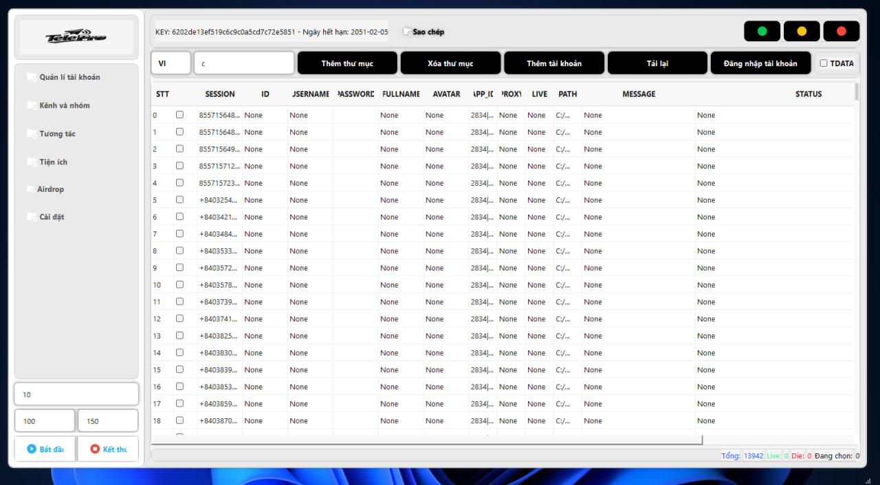 Die Software unterstützt Telegram mit vielen Funktionen, z. B.: Mitglieder zu Gruppen/Kanälen hinzufügen, Beitragsansichten verbessern, Kanalemotionen löschen, Gruppen säen, Massen-Spam-Nachrichten senden, Mitglieder online bringen …